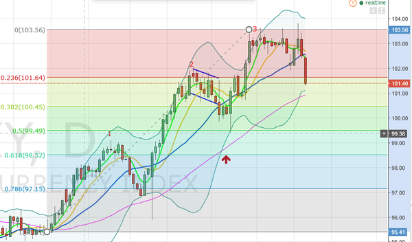 说完了数据面上的道理,下面说说技术面和基本面。下面是美元日线图。